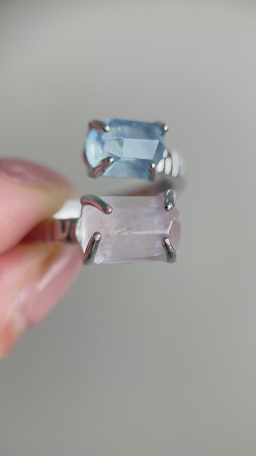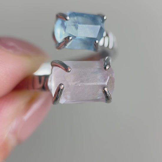 A twin stone ring featuring Aquamarine and Morganite from Brazil, hand-cut and polished to preserve the natural character of each crystal.