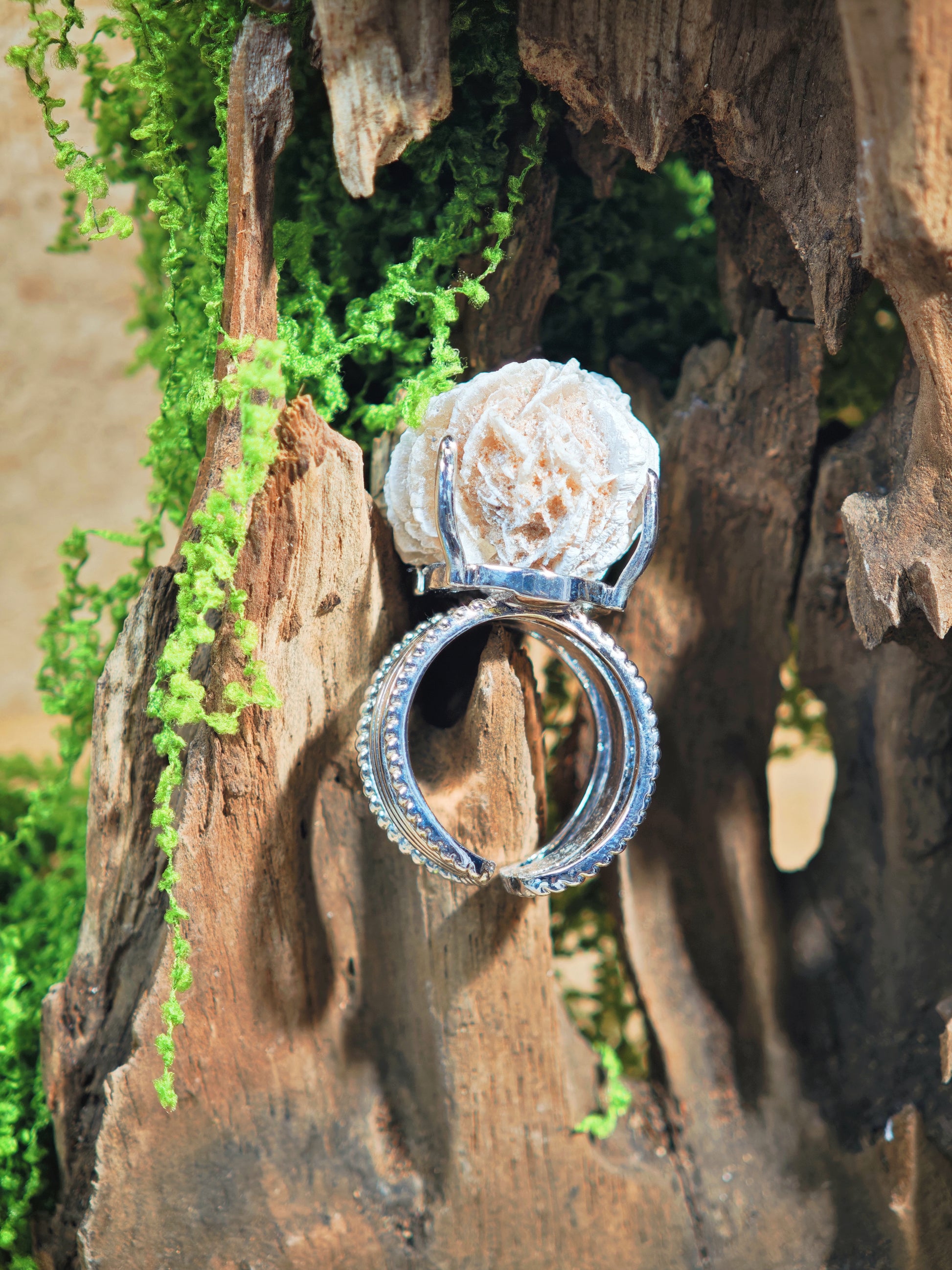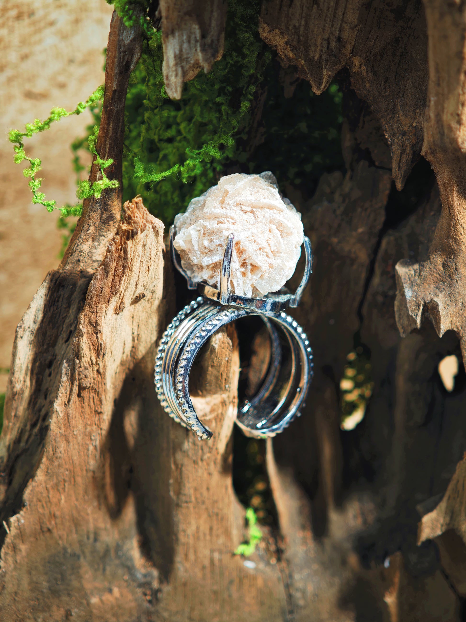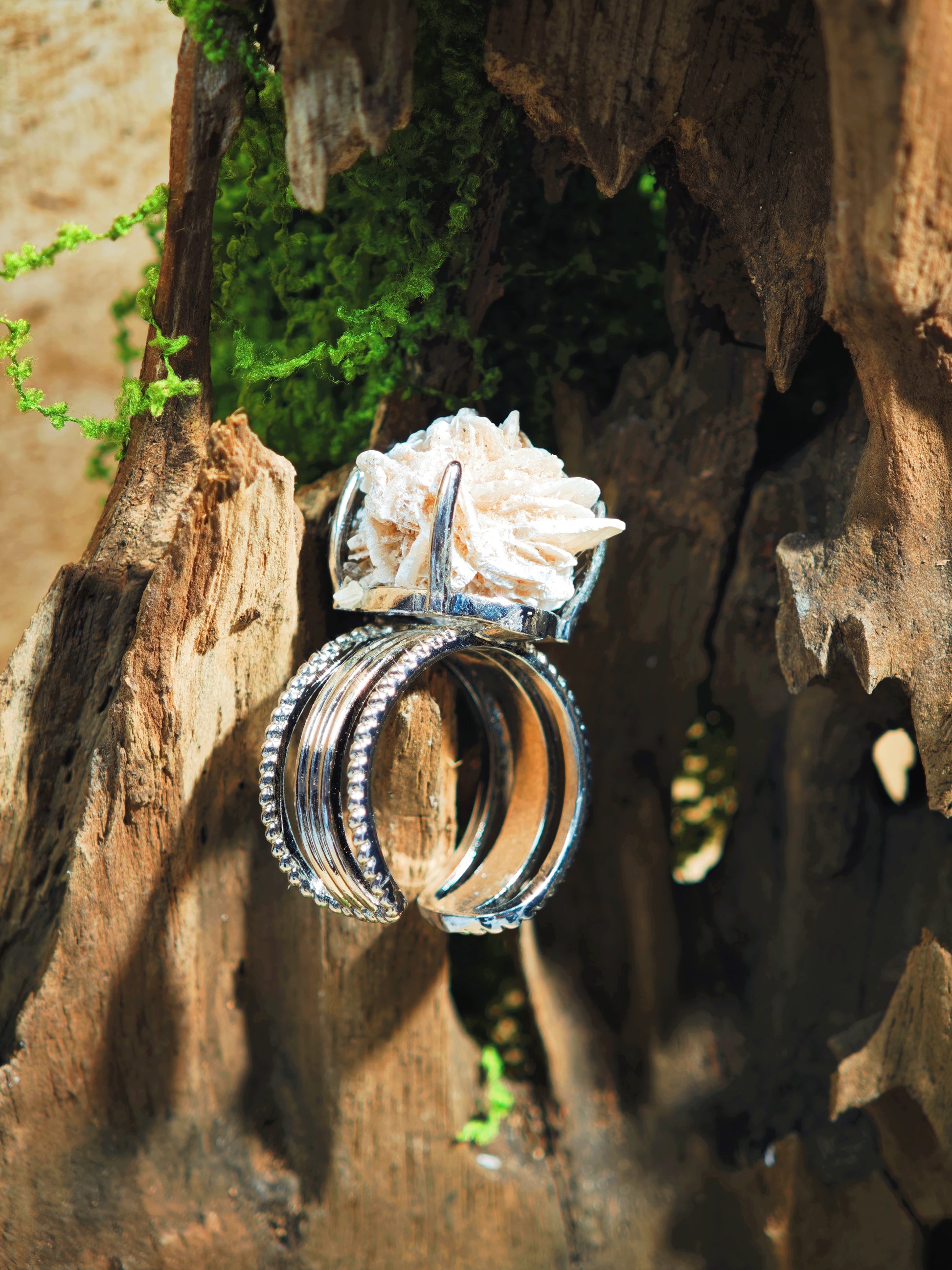 This ring holds the quiet strength of desert rose — a crystal that teaches you how to bloom through difficulty and soften into grace.
