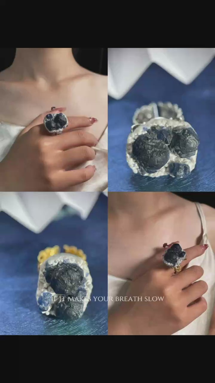 This blueberry fluorite ring brings a sense of quiet clarity. The soft purple-blue fluctuations cool down the thoughts and awaken deeper concentration and inspiration reception.