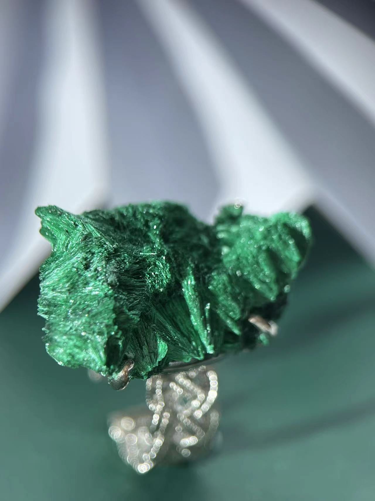 This malachite ring from Congo has a natural wavy energy texture and is a dual guardian stone for heart chakra healing and energy protection.