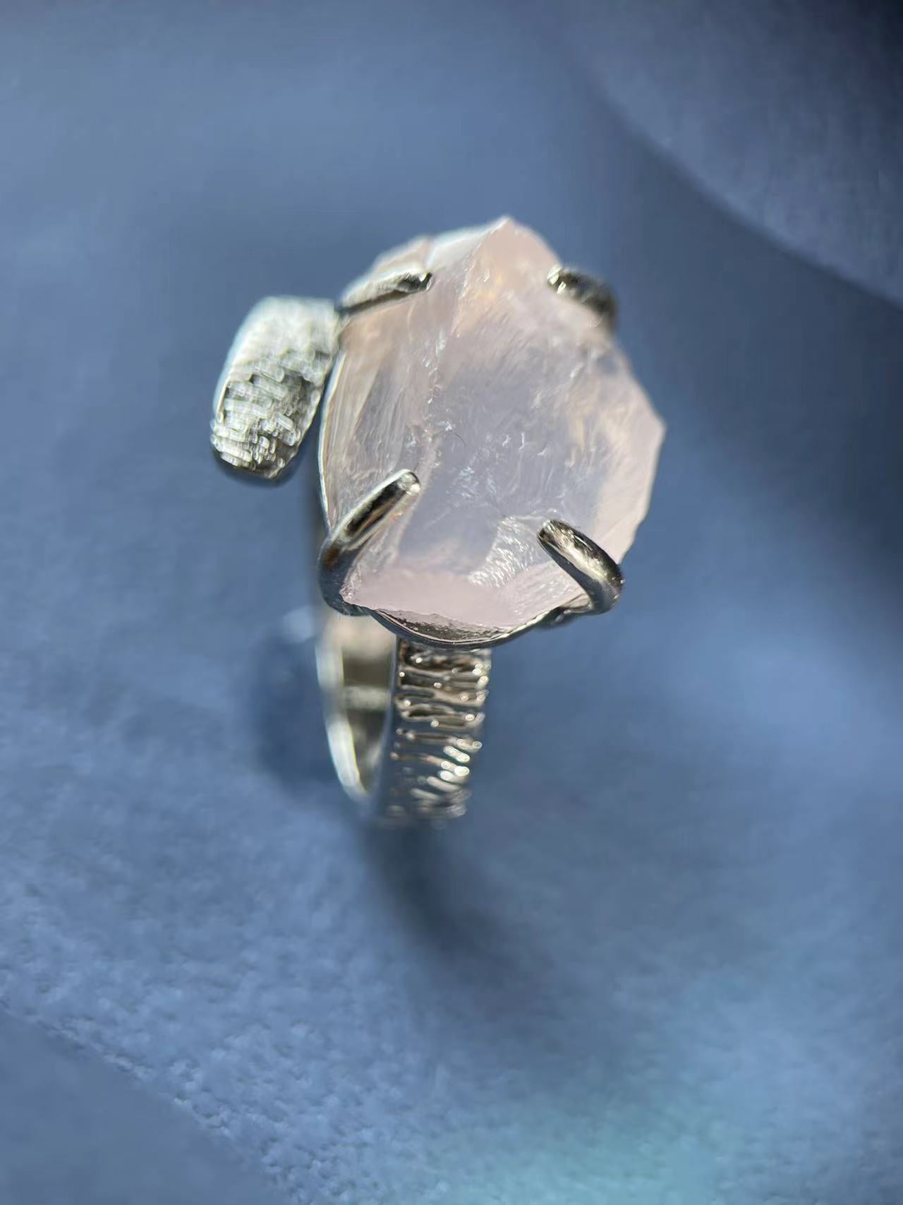 A talisman of tenderness, this raw Rose Quartz ring is a portal to the heart’s quiet wisdom.